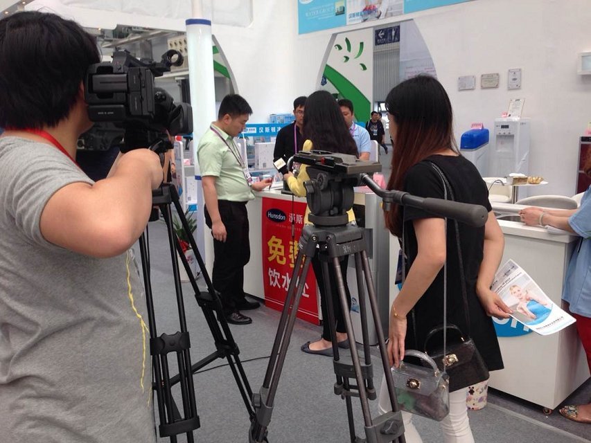 在交易會現場,記者看到人流量最集中的是一家家用凈水器品牌的展廳前,這家漢斯頓凈水器企業早前就代表昆山進交會明星參展企業亮相昆視新聞。聚集在這里的消費者大多是被展廳工作人員現場演示凈水器制水過程吸引過來的。門口的免費飲水臺現場制水可以提供直接飲用也吸引了不少消費者駐足了解。工作人員在不停的派發宣傳畫冊講解產品知識現場熱鬧非凡。