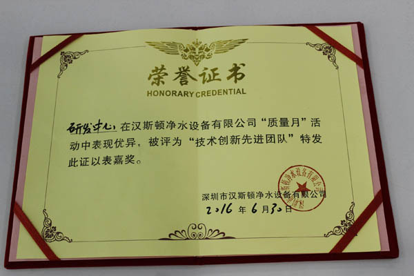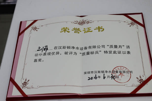在本次“質(zhì)量月”活動(dòng)中,漢斯頓研發(fā)部團(tuán)隊(duì)脫穎而出,其申請(qǐng)并通過(guò)的多項(xiàng)專(zhuān)利,如使用新型專(zhuān)利證書(shū)等,為公司凈水器技術(shù)突破做出了巨大的貢獻(xiàn),獲得了公司頒發(fā)的技術(shù)創(chuàng)新獎(jiǎng)榮譽(yù)證書(shū),并獲得了2000元獎(jiǎng)金。此外,質(zhì)量部和生產(chǎn)部的員工表現(xiàn)也十分出色,“質(zhì)量月”期間,他們以專(zhuān)業(yè)的態(tài)度和專(zhuān)注的質(zhì)量檢查精神,認(rèn)真而且細(xì)致地檢查好每一款產(chǎn)品,每一個(gè)生產(chǎn)環(huán)節(jié),最終,10名表現(xiàn)突出的員工被授予“質(zhì)量月”標(biāo)兵獎(jiǎng),每人獲得200元獎(jiǎng)勵(lì)。