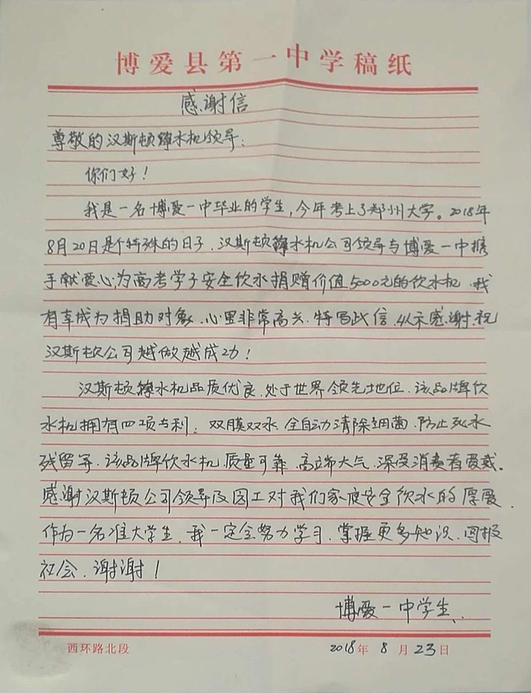 原來是河南博愛縣一位受助的高考學子為感謝漢斯頓的愛心捐助,以及對其家庭飲水環境的關注,特此寫下感謝信表示感謝。信中對漢斯頓產品給予充分的贊譽,表達對漢斯頓公益的觸動,并期待未來的自己也能回報社會,感恩社會!