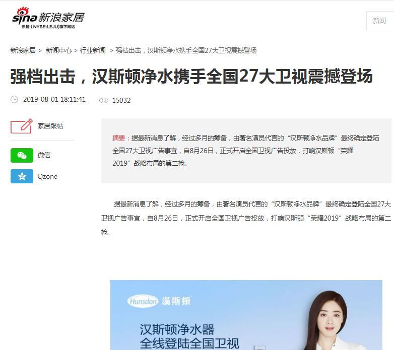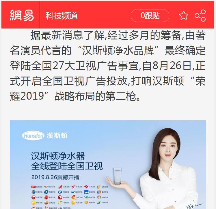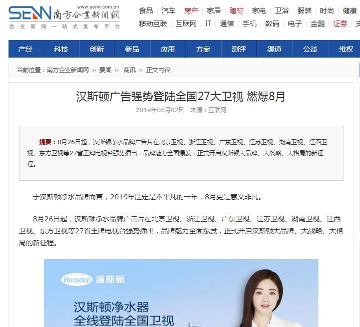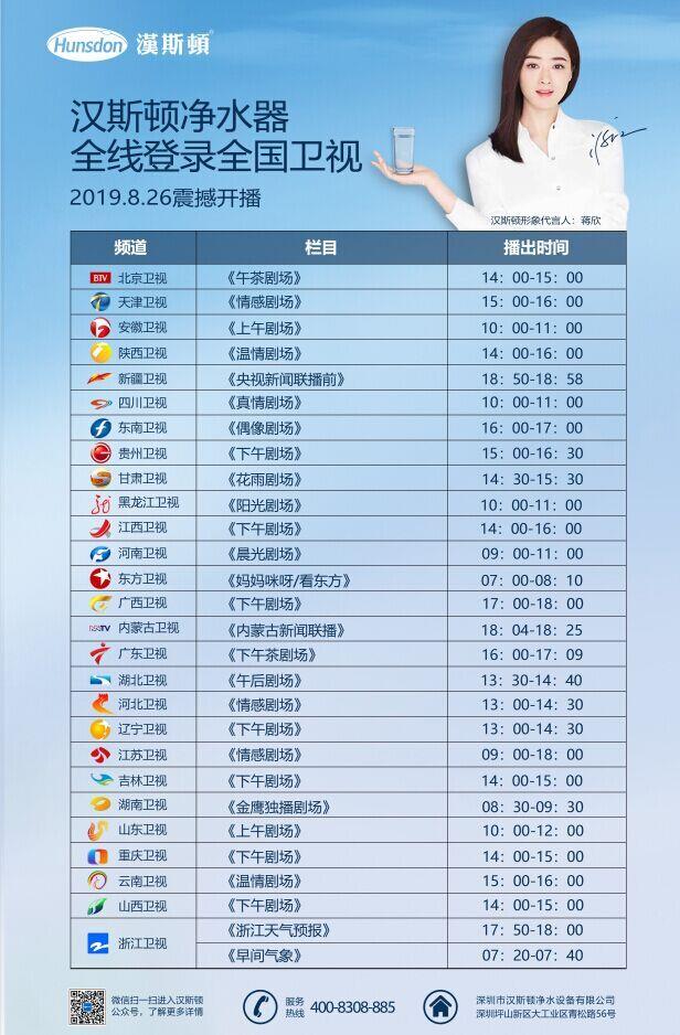 對(duì)漢斯頓品牌來(lái)講,2019年,注定是瘋狂的一年,是不平凡的一年,而8月更是意義非凡。「漢斯頓“榮耀2019」戰(zhàn)略布局的第二槍開(kāi)啟了。8月26日起,漢斯頓凈水品牌廣告片在北京衛(wèi)視、浙江衛(wèi)視、廣東衛(wèi)視、江蘇衛(wèi)視、湖南衛(wèi)視、江西衛(wèi)視、東方衛(wèi)視等27省王牌電視臺(tái)強(qiáng)勢(shì)播出,品牌魅力全面爆發(fā),高頻次亮相,強(qiáng)勁品牌推廣,敬請(qǐng)期待!
