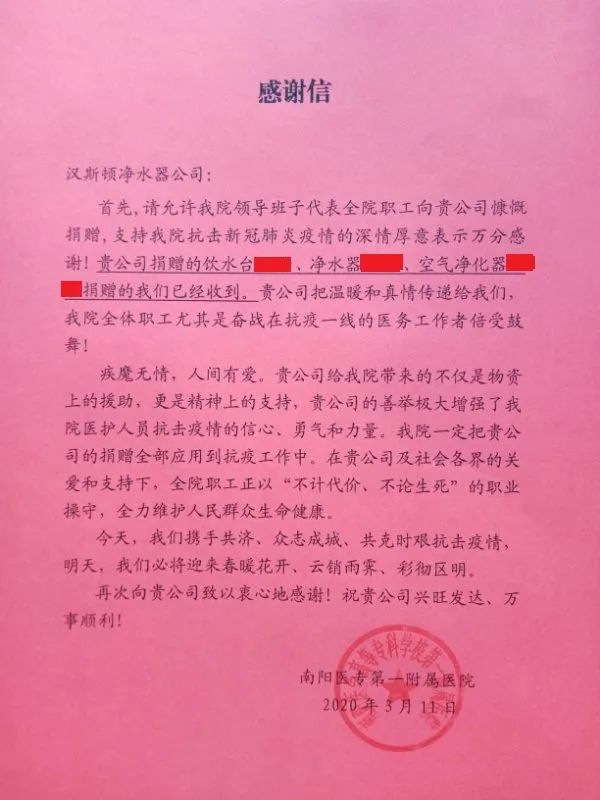 漢斯頓集團(tuán)向南陽(yáng)醫(yī)專第一附屬醫(yī)院捐贈(zèng)商用飲水臺(tái)、凈水器和多用途空氣凈化器等產(chǎn)品,為奮戰(zhàn)在抗“疫”一線的醫(yī)護(hù)人員提供多方位的防護(hù)保障。