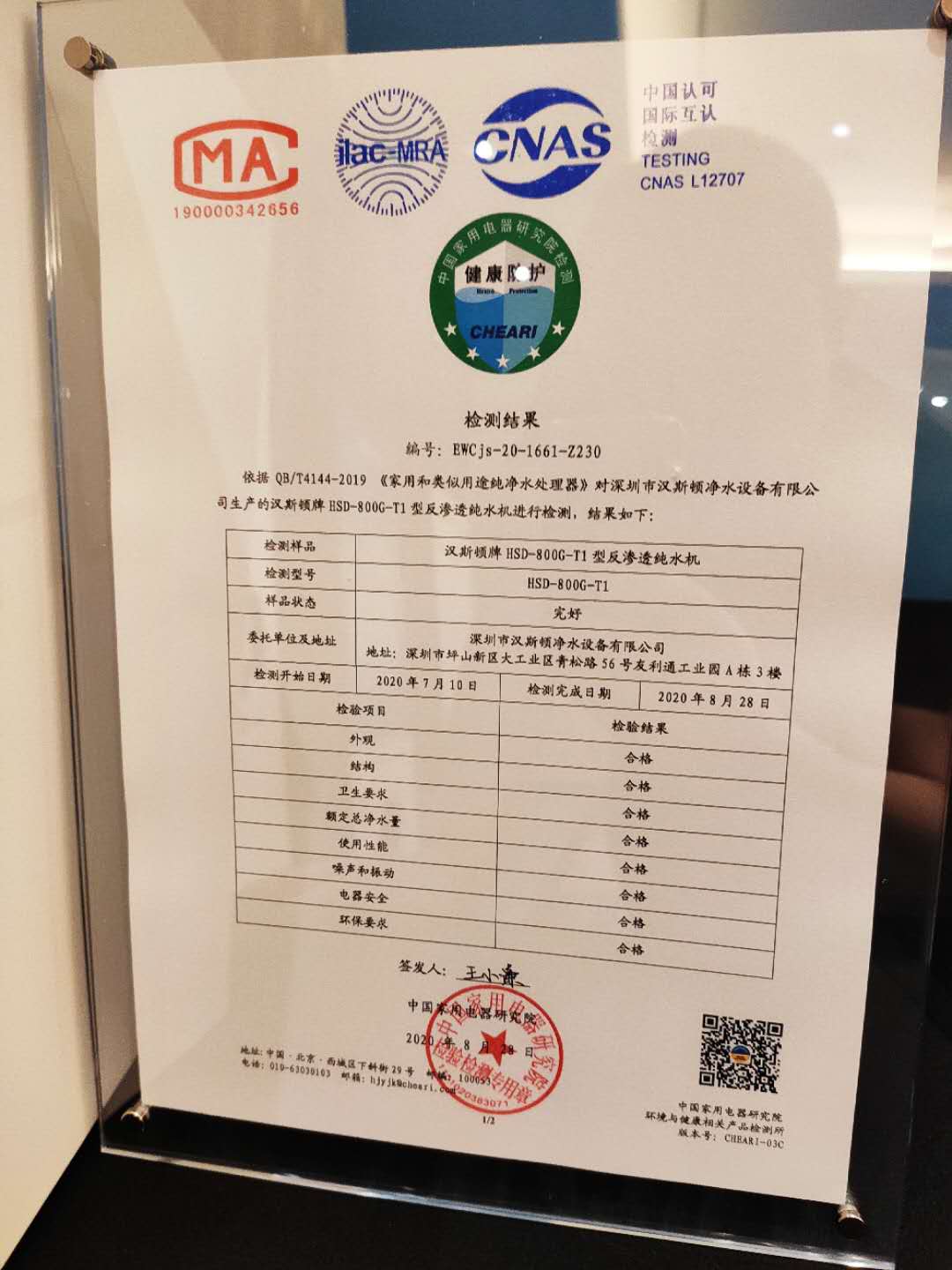 HSD-800G-T1作為漢斯頓集團的新晉熱銷產品,經相關部門檢測后,各項指標均符合新標準,成為首批通過QB/T 4143、QB/T 4144產品標準的凈水器之一,并榮獲本次大會主辦單位頒發的榮譽證書。