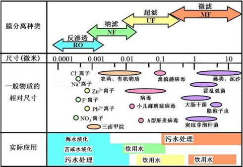濾芯是一個(gè)凈水器是否能有效去除水中雜質(zhì)的關(guān)鍵,不同種類的濾芯會(huì)將不同大小的微粒物質(zhì)從水中除去,最終決定產(chǎn)品水的水質(zhì)。濾芯按孔徑大小分為微濾、超濾、納濾(現(xiàn)在一般不怎么提倡)、反滲透。如圖: