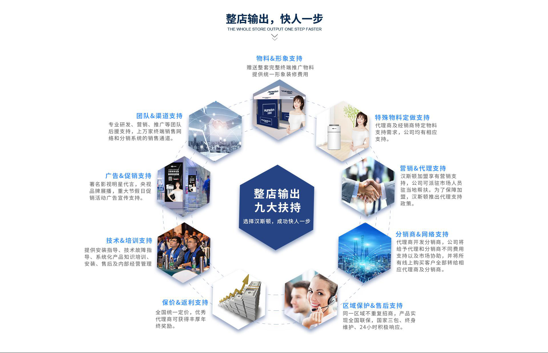 漢斯頓凈水器產品豐富、應用廣泛、對代理加盟商的政策扶持優于同行。以“低起點、多角度”制定加盟合作經營政策,低門檻、低風險,0加盟費、0保證金、0管理費!以“打造精品品牌,以品牌帶動宣傳,以規模促動效益”為戰略,把“形象工程”與公司的發展緊密結合,同時積極發展環保、健康的凈水產品,打牢技術壁壘,給加盟代理商有力后盾支持。加盟漢斯頓,我們將給予您區域領導品牌的支持。